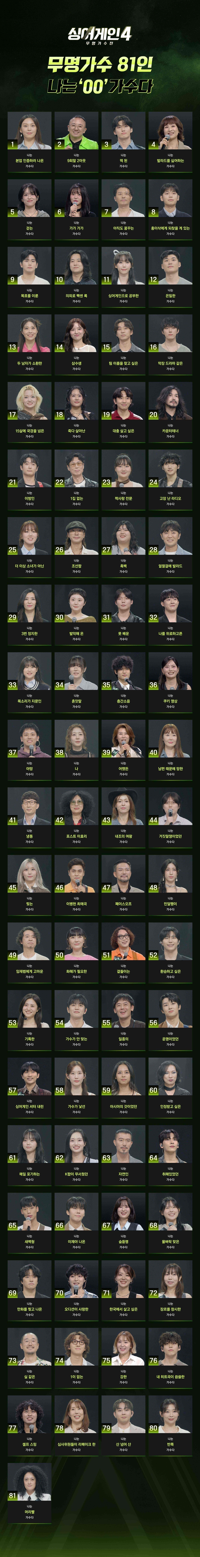 드디어 기다리던 JTBC 오디션 프로그램 ‘싱어게인4-무명가수전’이 본선 진출자 81인을 공개했습니다.